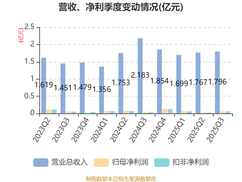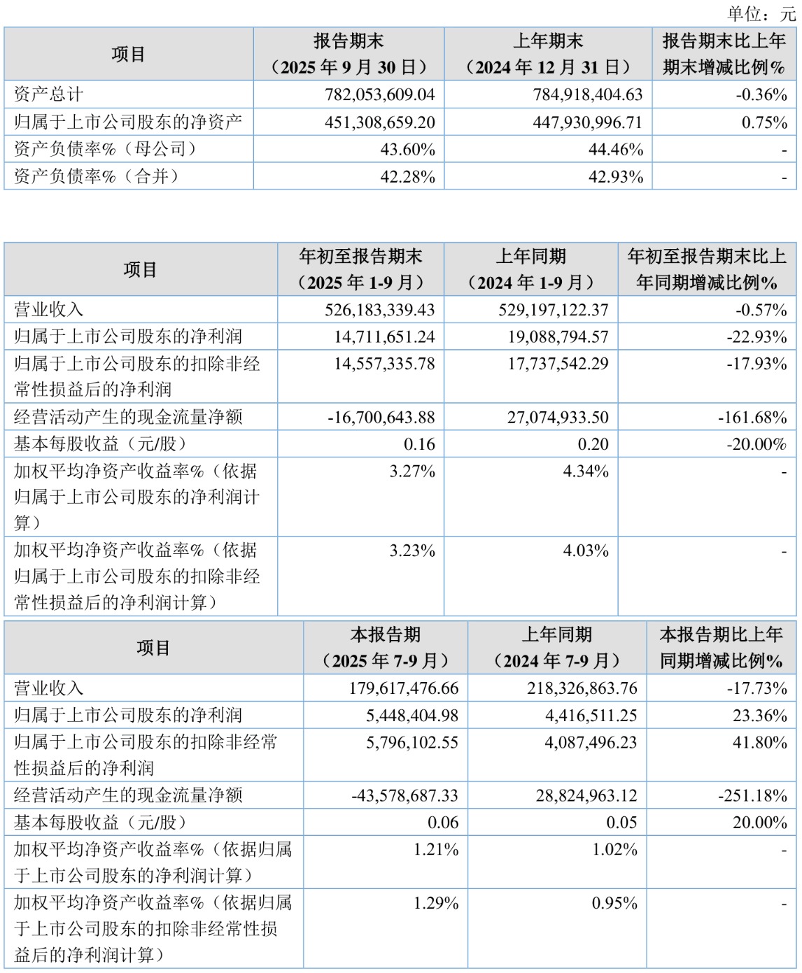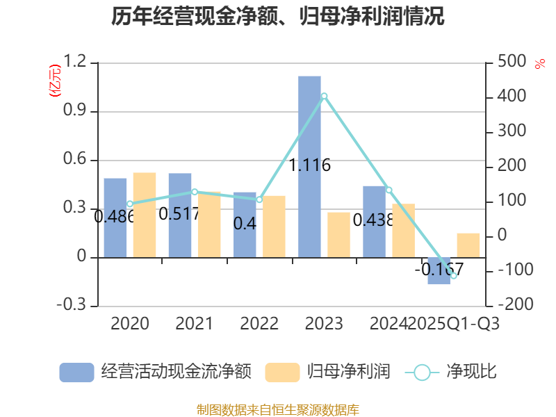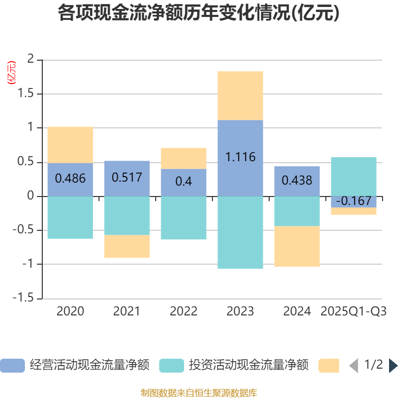 2025年前三季度,公司经营活动现金流净额为-1670.06万元,同比减少4377.56万元;筹资活动现金流净额-1061.4万元,同比增加5093.38万元;投资活动现金流净额5713.92万元,上年同期为-4083.84万元。