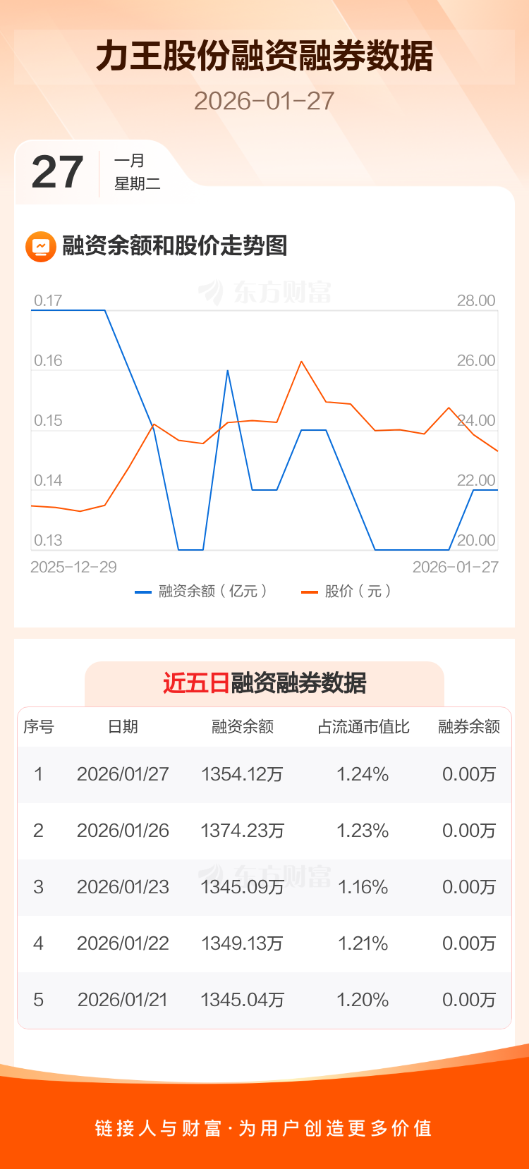 交易所最新数据显示,力王股份于2026年1月27日获融资买入141.19万元,融资偿还161.30万元,当日融资净偿还20.11万元。目前,该股融资余额1354.12万,占流通市值比例为1.24%。