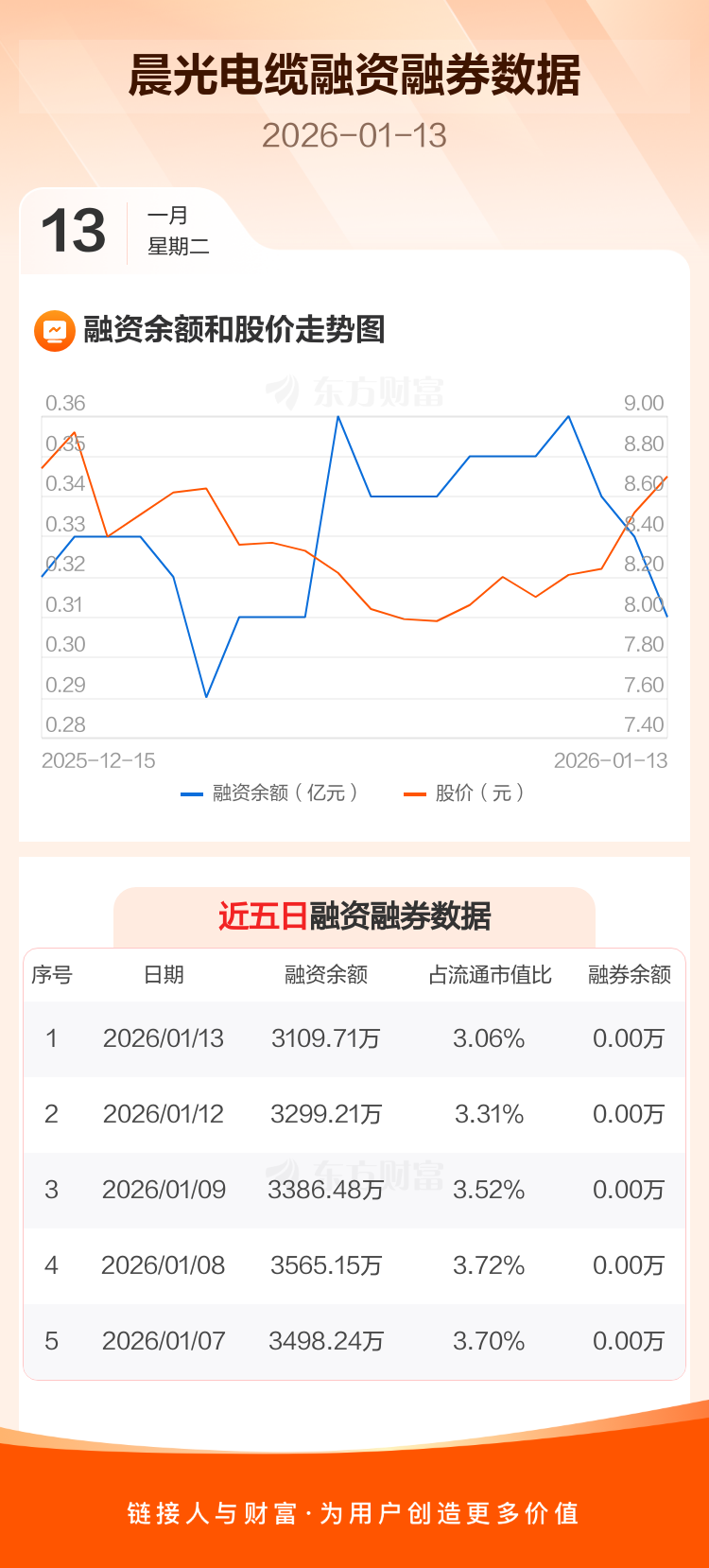 交易所最新数据显示,晨光电缆于2026年1月13日获融资买入232.01万元,融资偿还421.51万元,当日融资净偿还189.5万元。目前,该股融资余额3109.71万,占流通市值比例为3.06%。