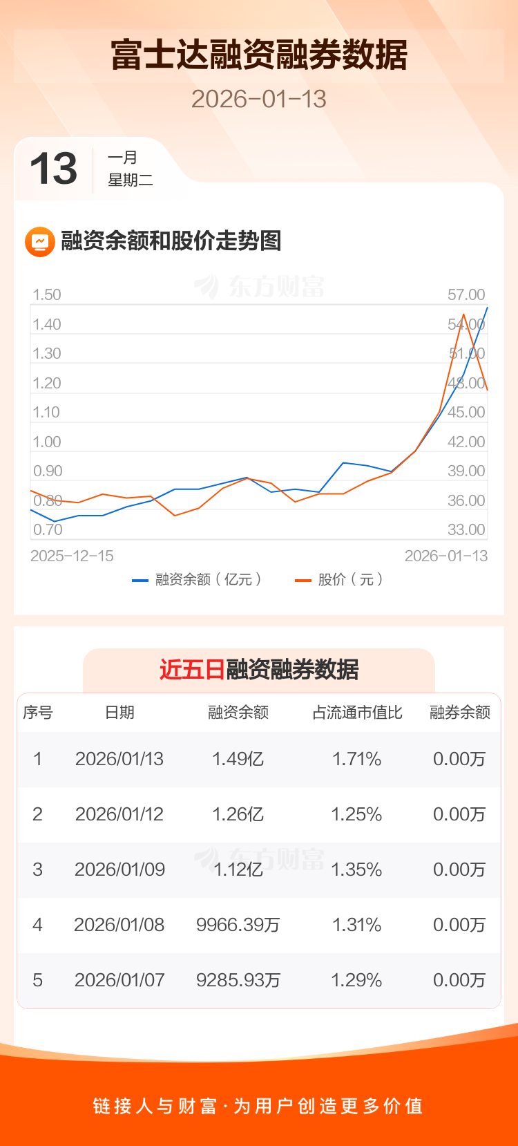 交易所最新数据显示,富士达于2026年1月13日获融资买入8743.52万元,融资偿还6449.27万元,当日融资净买入2294.24万元。目前,该股融资余额1.49亿,占流通市值比例为1.71%。
