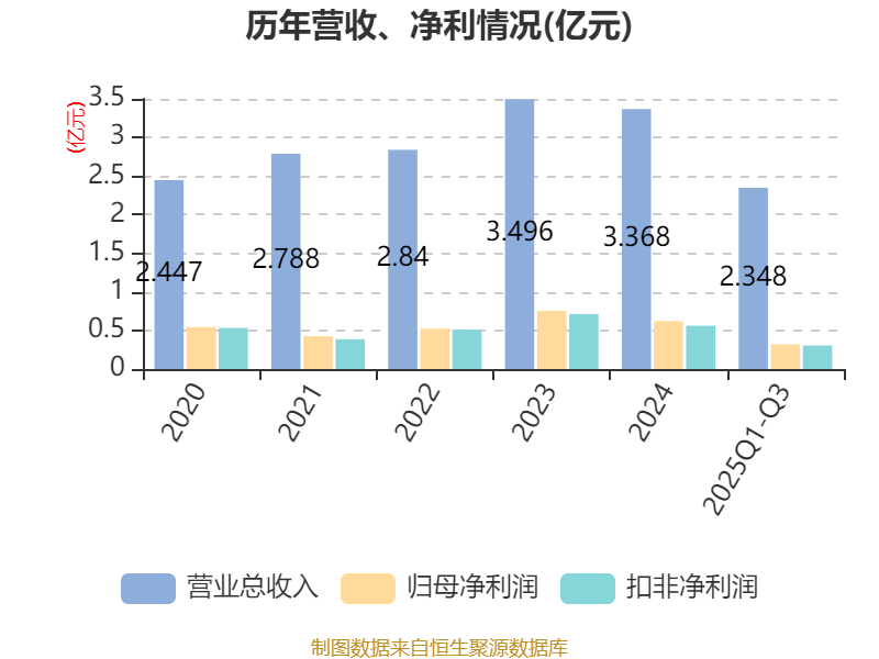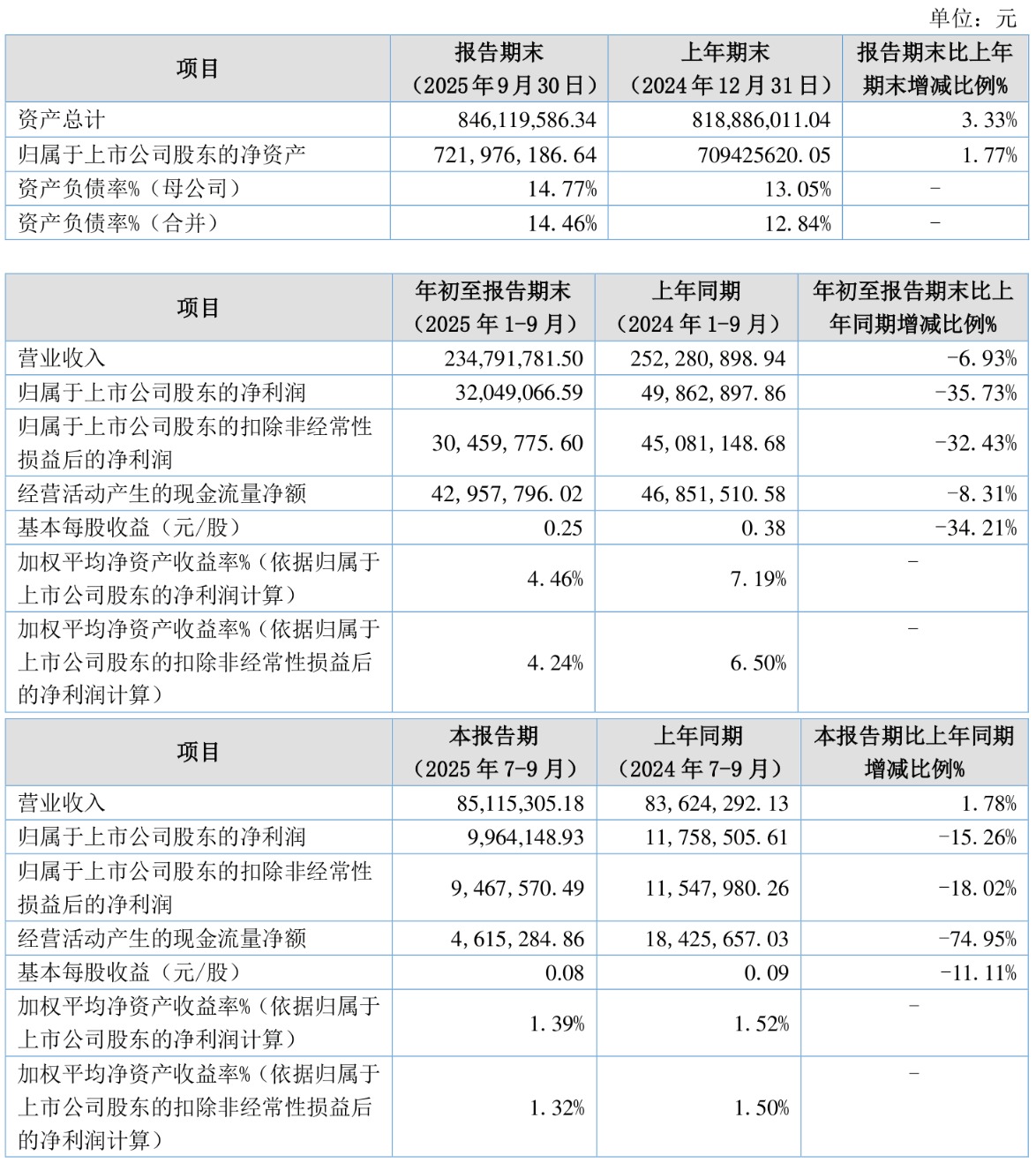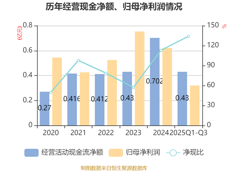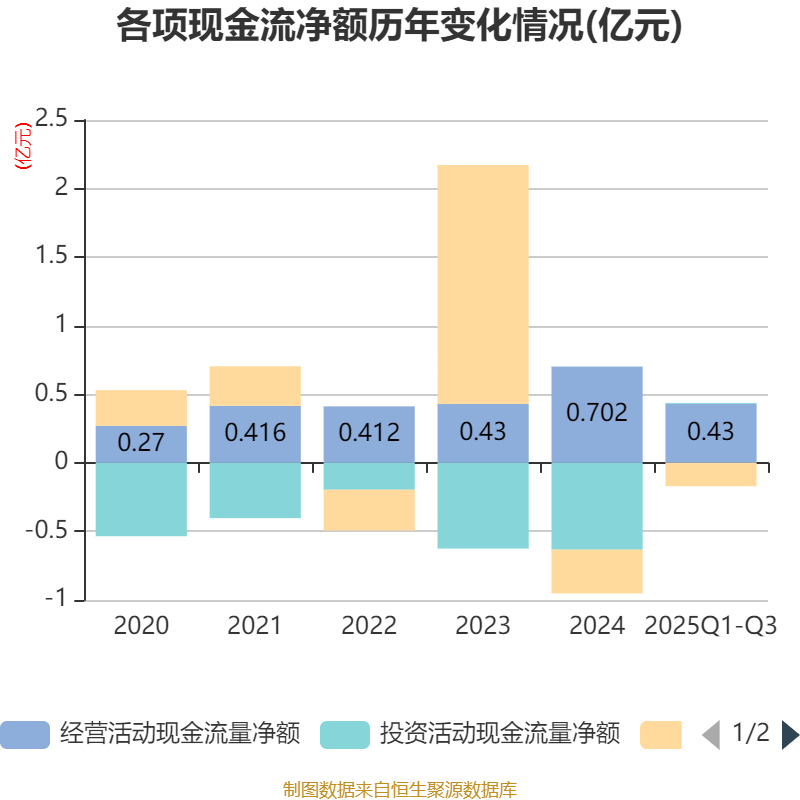 2025年前三季度,公司经营活动现金流净额为4295.78万元,同比下降8.31%;筹资活动现金流净额-1702.36万元,同比增加1805.19万元;投资活动现金流净额71.67万元,上年同期为4899.01万元。