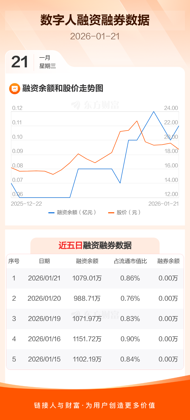 交易所最新数据显示,数字人于2026年1月21日获融资买入210.16万元,融资偿还119.86万元,当日融资净买入90.3万元。目前,该股融资余额1079.01万,占流通市值比例为0.86%。