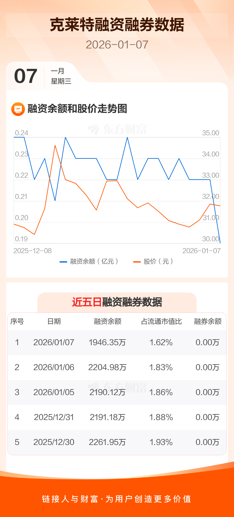 交易所最新数据显示,克莱特于2026年1月7日获融资买入179.88万元,融资偿还438.51万元,当日融资净偿还258.63万元。目前,该股融资余额1946.35万,占流通市值比例为1.62%。