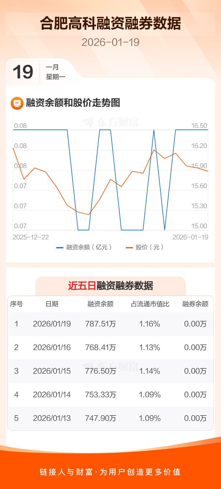 交易所最新数据显示,合肥高科于2026年1月19日获融资买入52.11万元,融资偿还33.01万元,当日融资净买入19.1万元。目前,该股融资余额787.51万,占流通市值比例为1.16%。