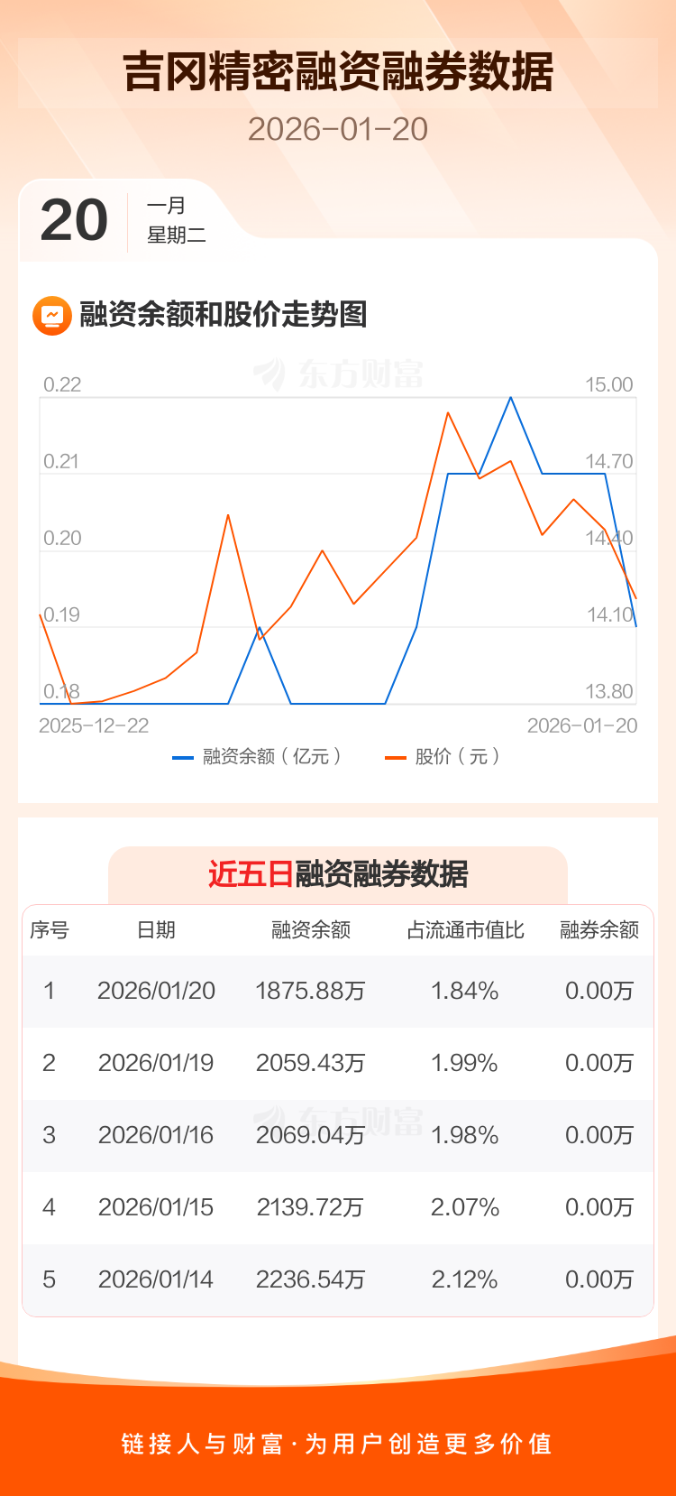 交易所最新数据显示,吉冈精密于2026年1月20日获融资买入192.68万元,融资偿还376.23万元,当日融资净偿还183.55万元。目前,该股融资余额1875.88万,占流通市值比例为1.84%。