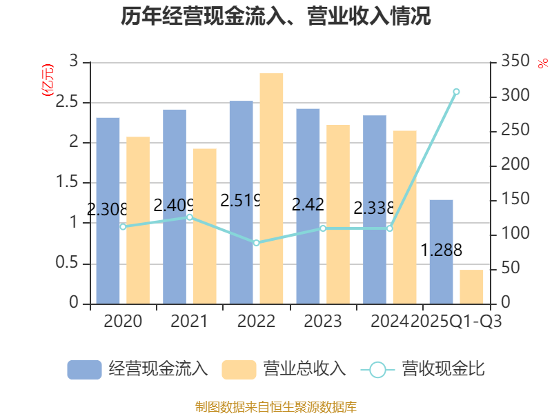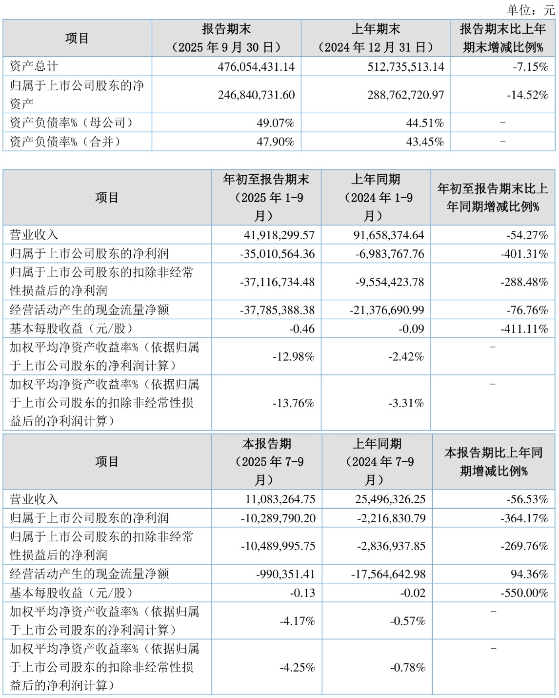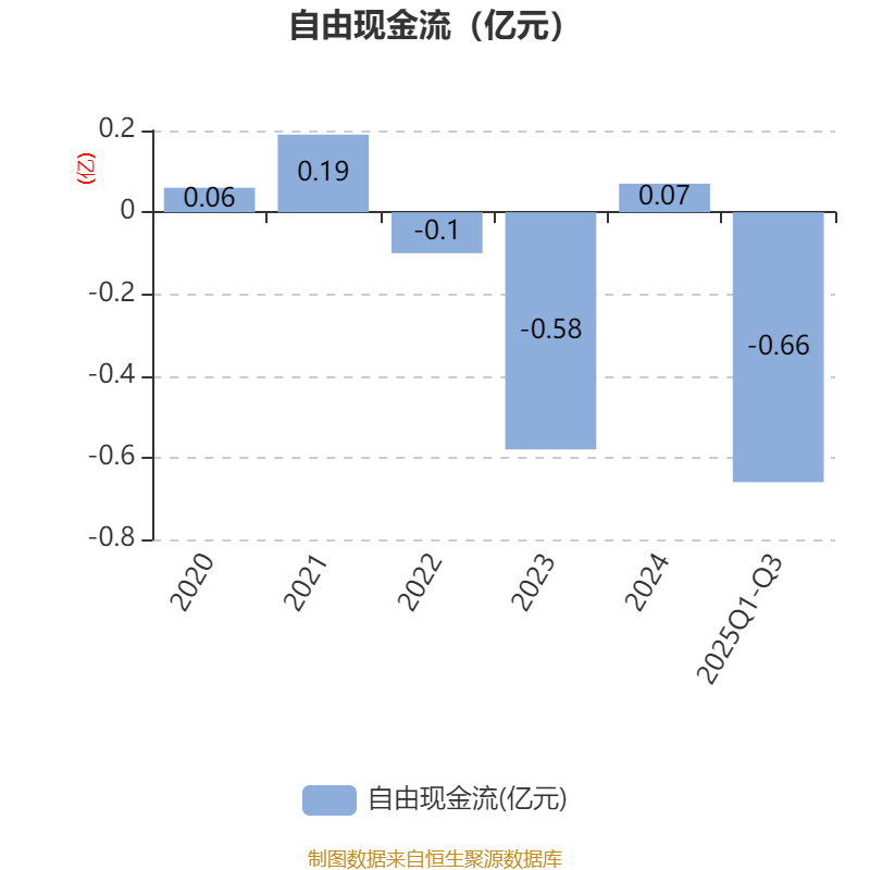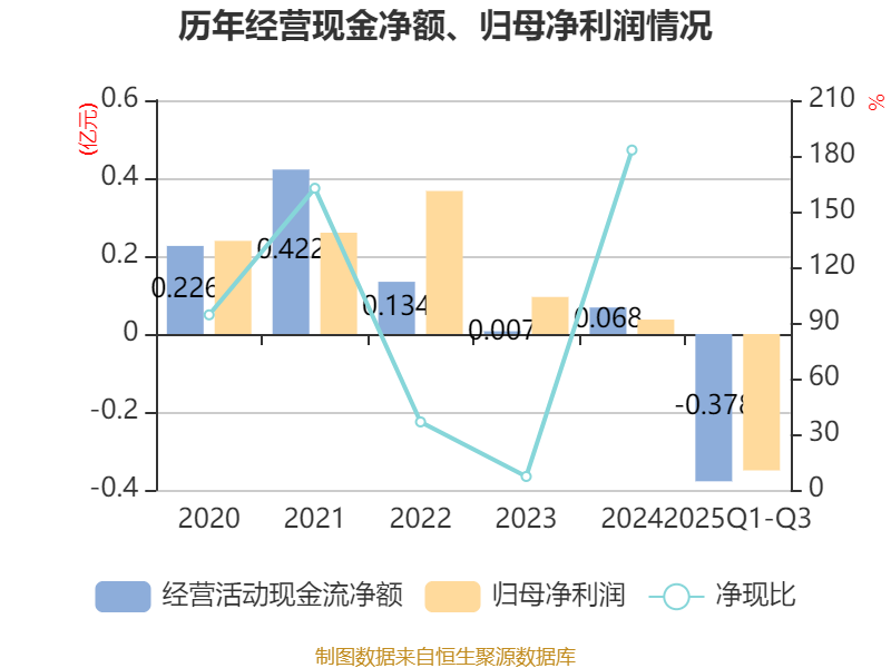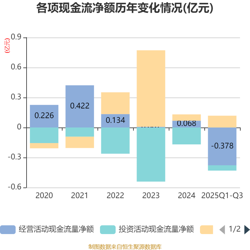 2025年前三季度,公司经营活动现金流净额为-3778.54万元,同比减少1640.87万元;筹资活动现金流净额1179.57万元,同比增加2458.54万元;投资活动现金流净额-526.72万元,上年同期为-1004.79万元。