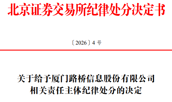 据北交所2月6日消息,2月5日,北交所发布的《 关于给予厦门路桥信息股份有限公司相关责任主体纪律处分的决定》显示,路桥信息因在2023年和2024年通过虚构业务等方式虚增收入和利润,导致年度报告存在虚假记载,11名时任董监高人员被给予通报批评处分,并记入证券期货市场诚信档案。