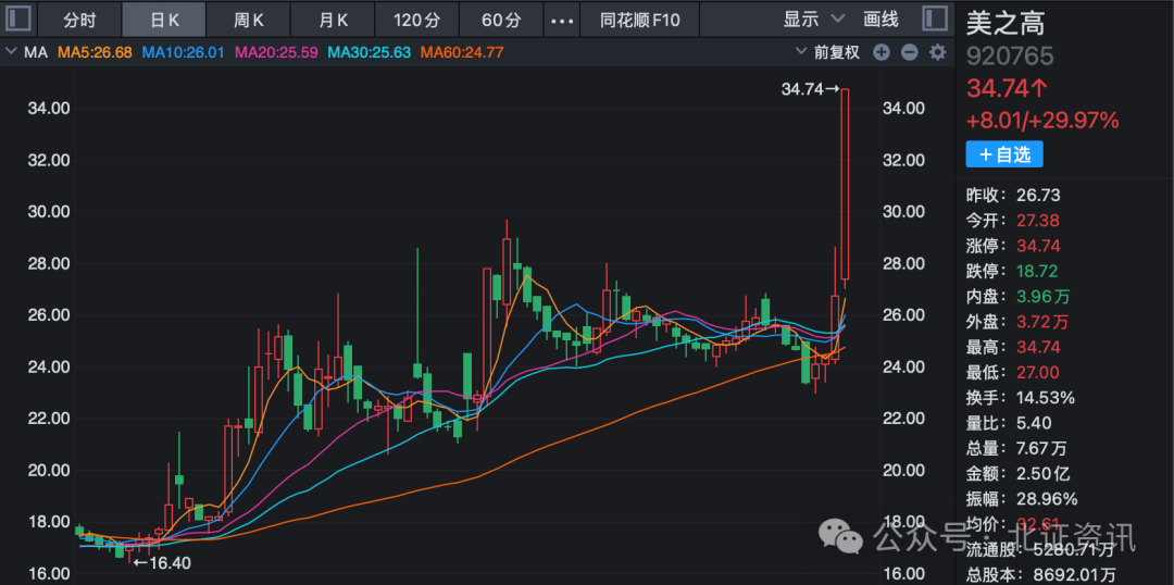 12月16日午后,北交所股票美之高强势涨停,该股本周两个交易日累计大涨超42%。