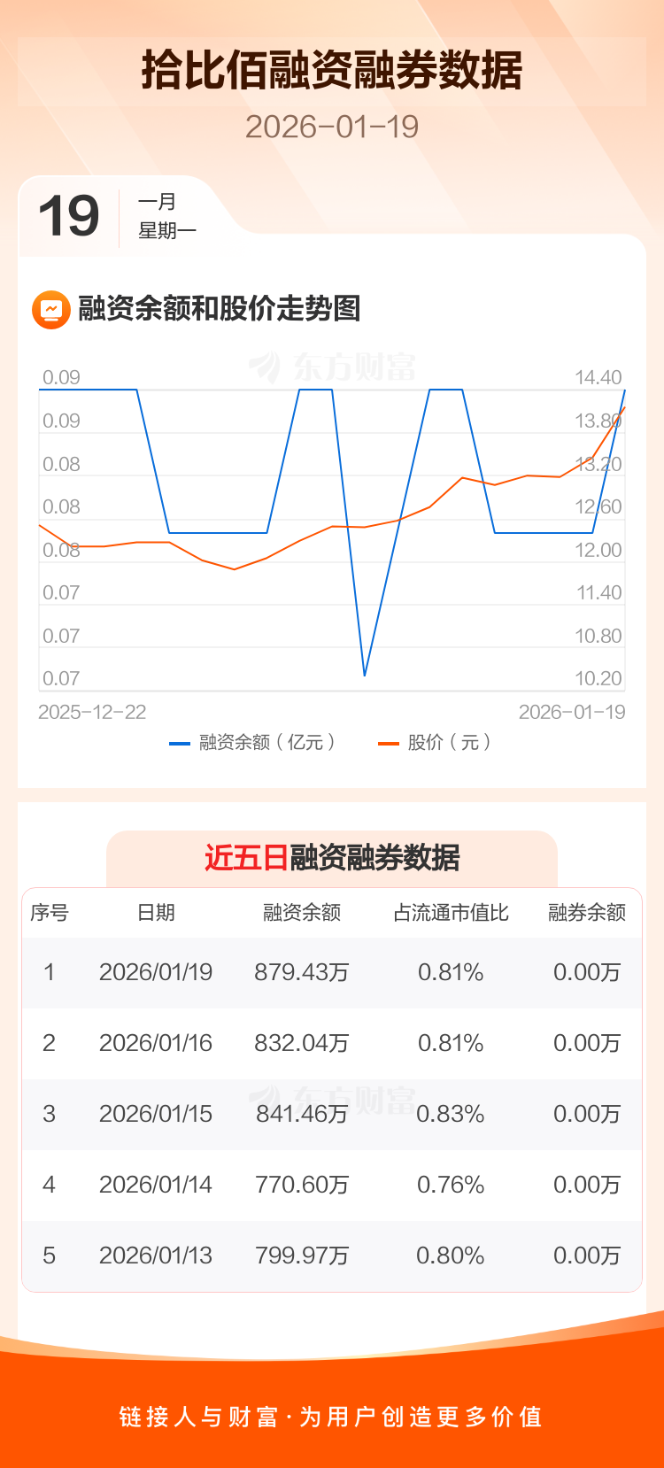 交易所最新数据显示,拾比佰于2026年1月19日获融资买入136.38万元,融资偿还88.98万元,当日融资净买入47.39万元。目前,该股融资余额879.43万,占流通市值比例为0.81%。
