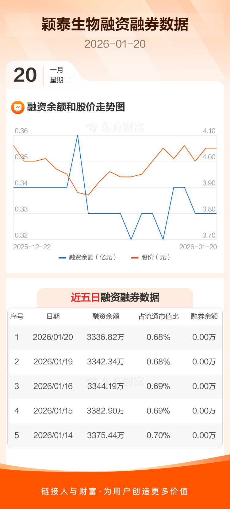 交易所最新数据显示,颖泰生物于2026年1月20日获融资买入54.05万元,融资偿还59.57万元,当日融资净偿还5.52万元。目前,该股融资余额3336.82万,占流通市值比例为0.68%。