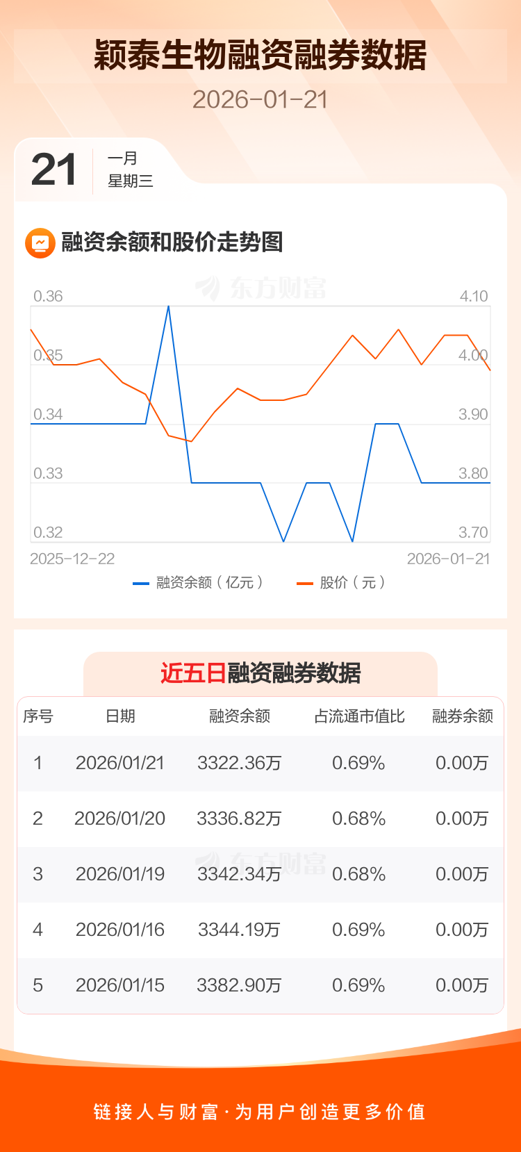 交易所最新数据显示,颖泰生物于2026年1月21日获融资买入72.34万元,融资偿还86.81万元,当日融资净偿还14.47万元。目前,该股融资余额3322.36万,占流通市值比例为0.69%。