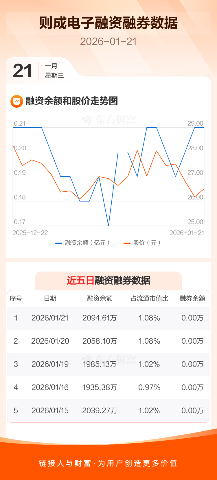 交易所最新数据显示,则成电子于2026年1月21日获融资买入126.91万元,融资偿还90.40万元,当日融资净买入36.51万元。目前,该股融资余额2094.61万,占流通市值比例为1.08%。
