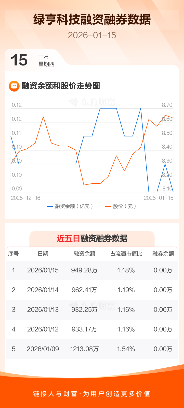 交易所最新数据显示,绿亨科技于2026年1月15日获融资买入202.25万元,融资偿还215.38万元,当日融资净偿还13.13万元。目前,该股融资余额949.28万,占流通市值比例为1.18%。