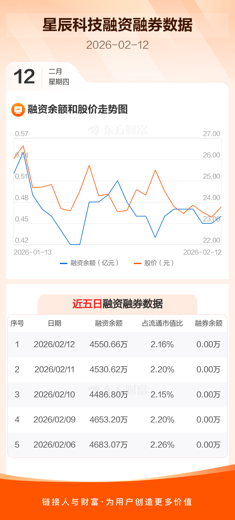 交易所最新数据显示,星辰科技于2026年2月12日获融资买入565.06万元,融资偿还545.03万元,当日融资净买入20.04万元。目前,该股融资余额4550.66万,占流通市值比例为2.16%。