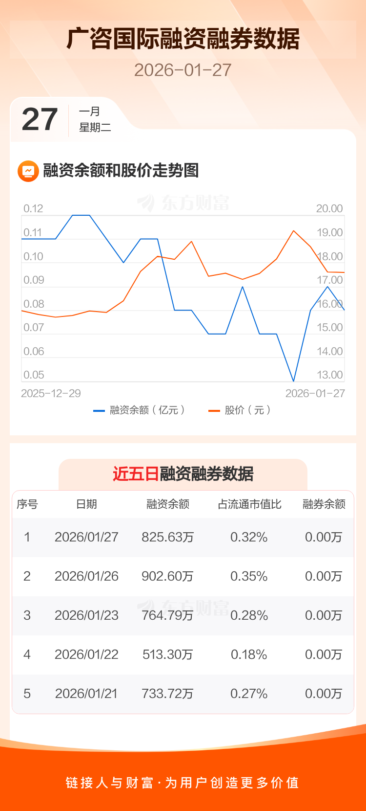 交易所最新数据显示,广咨国际于2026年1月27日获融资买入148.48万元,融资偿还225.45万元,当日融资净偿还76.97万元。目前,该股融资余额825.63万,占流通市值比例为0.32%。