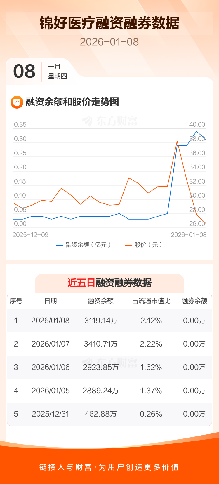 交易所最新数据显示,锦好医疗于2026年1月8日获融资买入984.43万元,融资偿还1276.00万元,当日融资净偿还291.57万元。目前,该股融资余额3119.14万,占流通市值比例为2.12%。