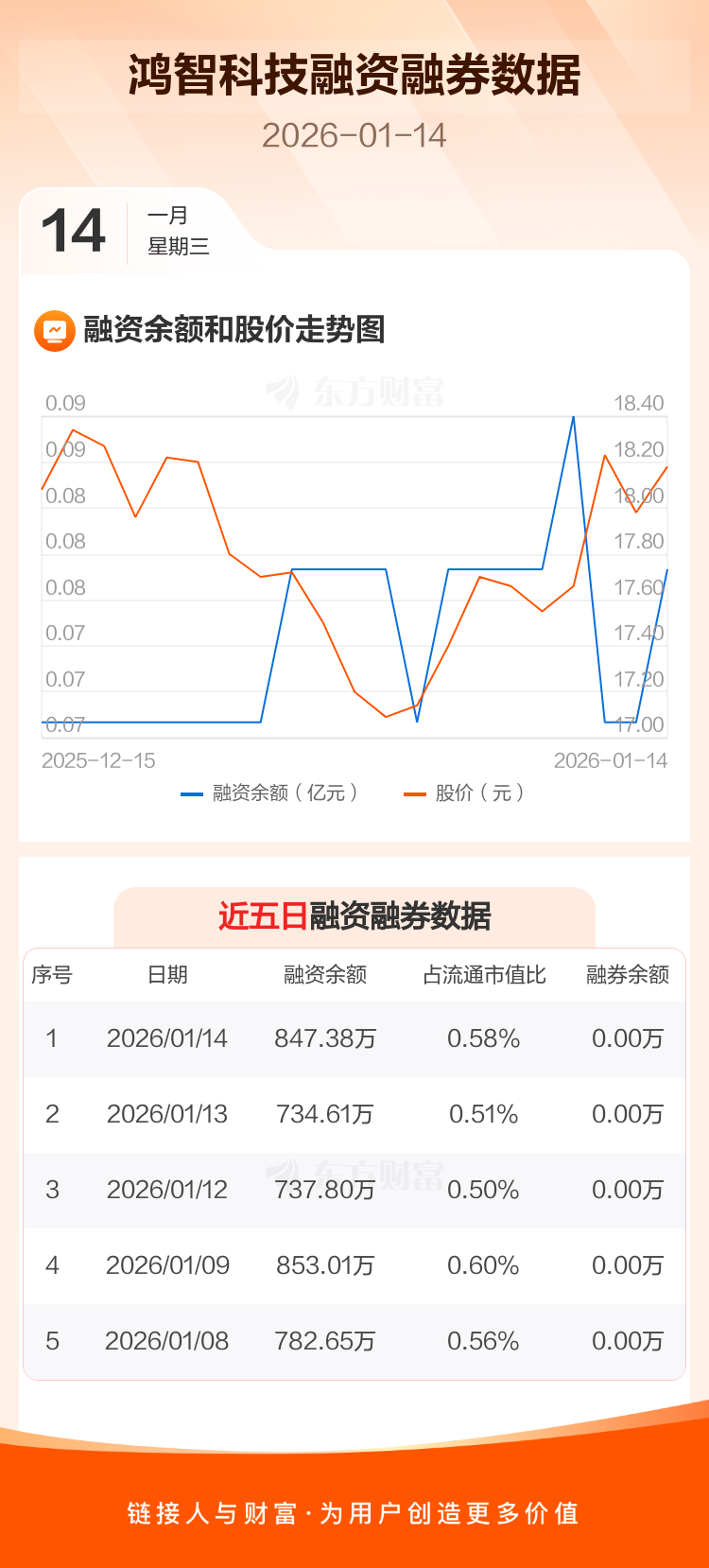 交易所最新数据显示,鸿智科技于2026年1月14日获融资买入252.23万元,融资偿还139.46万元,当日融资净买入112.77万元。目前,该股融资余额847.38万,占流通市值比例为0.58%。