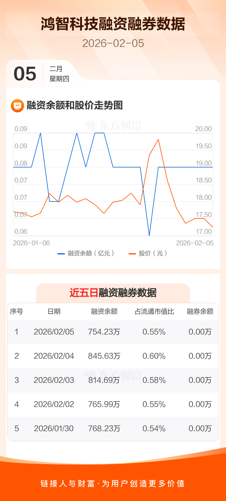 交易所最新数据显示,鸿智科技于2026年2月5日获融资买入70.80万元,融资偿还162.20万元,当日融资净偿还91.4万元。目前,该股融资余额754.23万,占流通市值比例为0.55%。