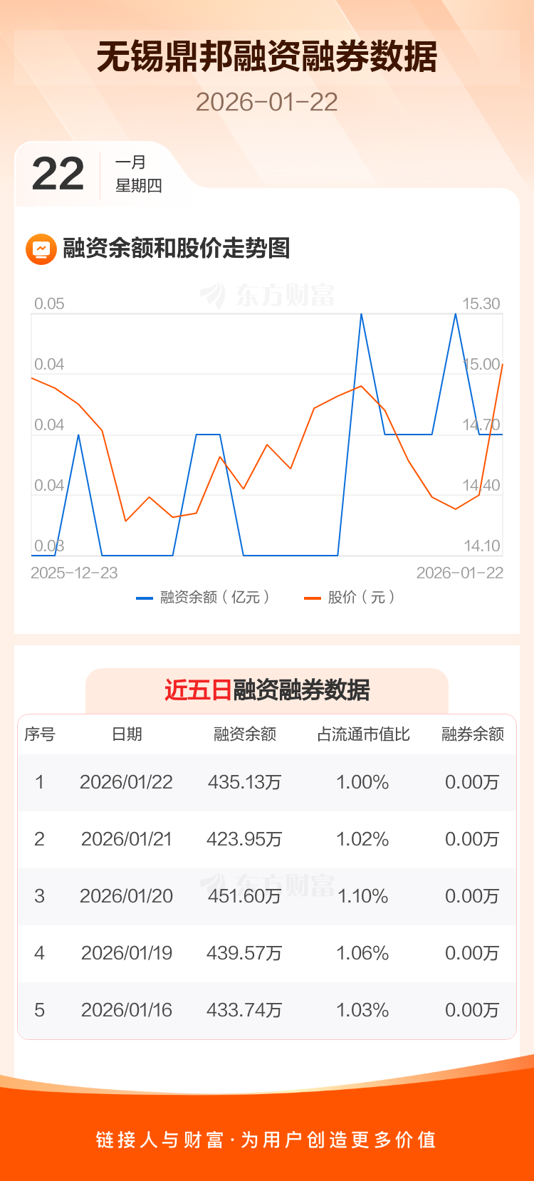 交易所最新数据显示,无锡鼎邦于2026年1月22日获融资买入38.41万元,融资偿还27.23万元,当日融资净买入11.18万元。目前,该股融资余额435.13万,占流通市值比例为1.00%。