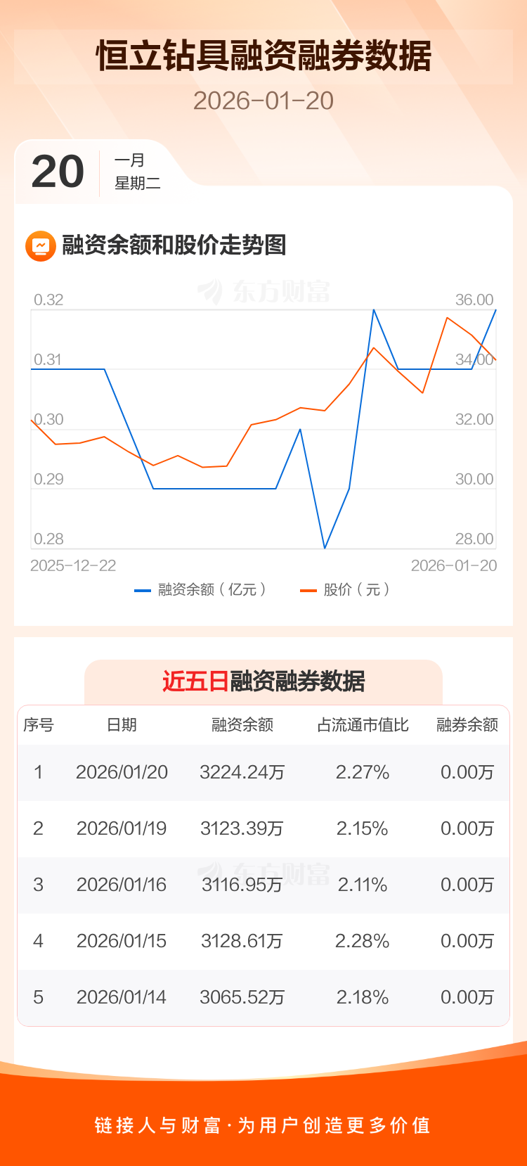 交易所最新数据显示,恒立钻具于2026年1月20日获融资买入449.14万元,融资偿还348.29万元,当日融资净买入100.85万元。目前,该股融资余额3224.24万,占流通市值比例为2.27%。