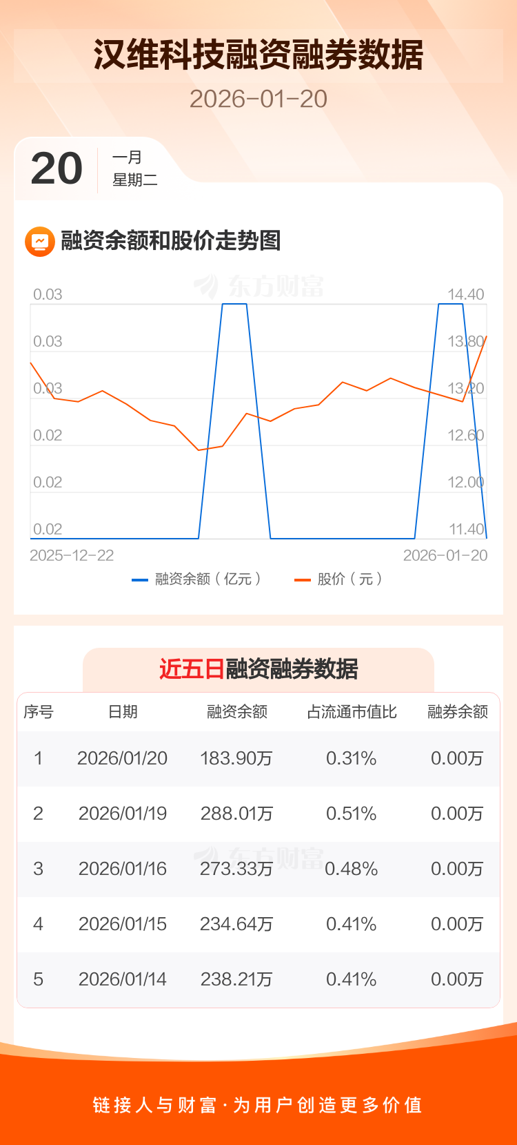 交易所最新数据显示,汉维科技于2026年1月20日获融资买入127.11万元,融资偿还231.23万元,当日融资净偿还104.12万元。目前,该股融资余额183.90万,占流通市值比例为0.31%。