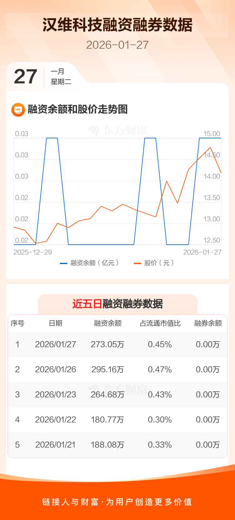 交易所最新数据显示,汉维科技于2026年1月27日获融资买入123.26万元,融资偿还145.36万元,当日融资净偿还22.11万元。目前,该股融资余额273.05万,占流通市值比例为0.45%。