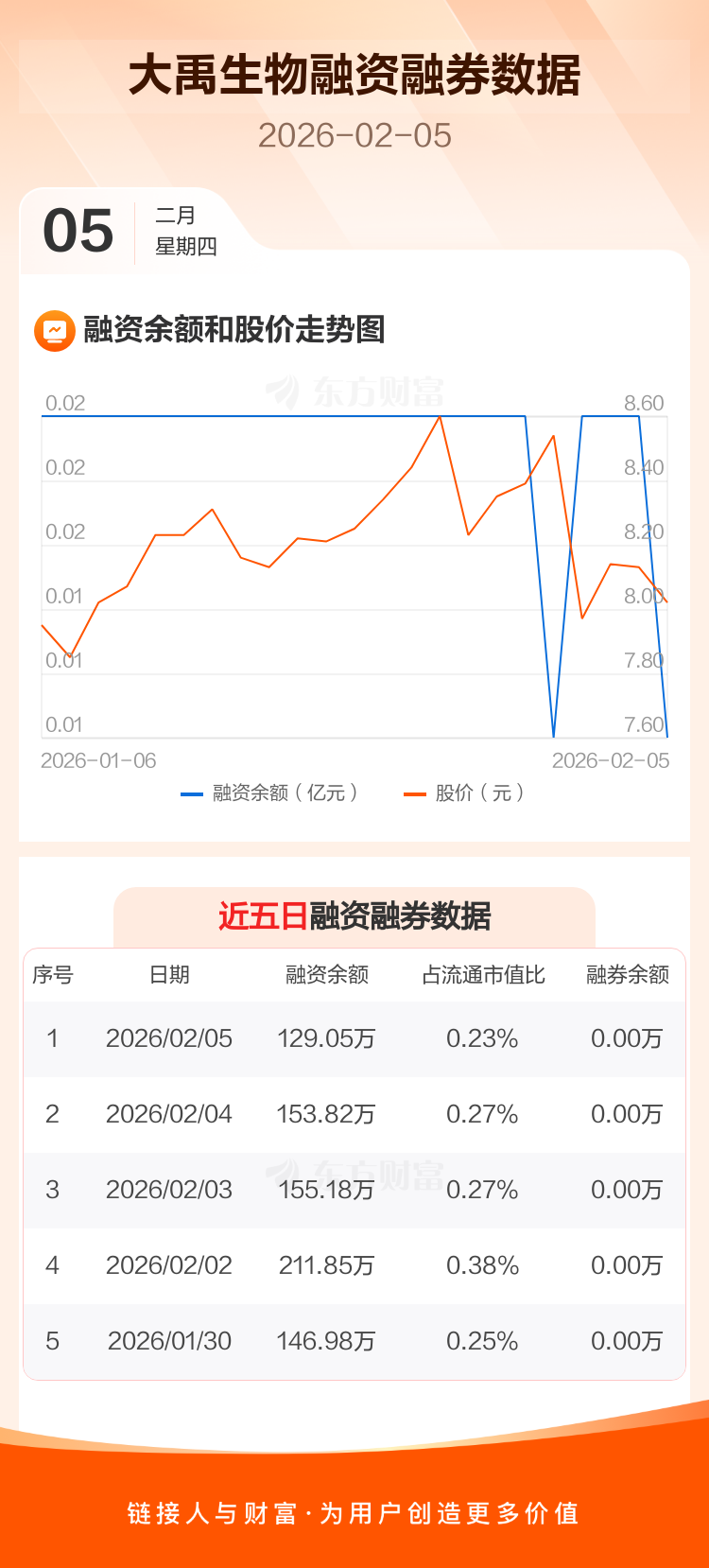 交易所最新数据显示,大禹生物于2026年2月5日获融资买入0元,融资偿还24.77万元,当日融资净偿还24.77万元。目前,该股融资余额129.05万,占流通市值比例为0.23%。