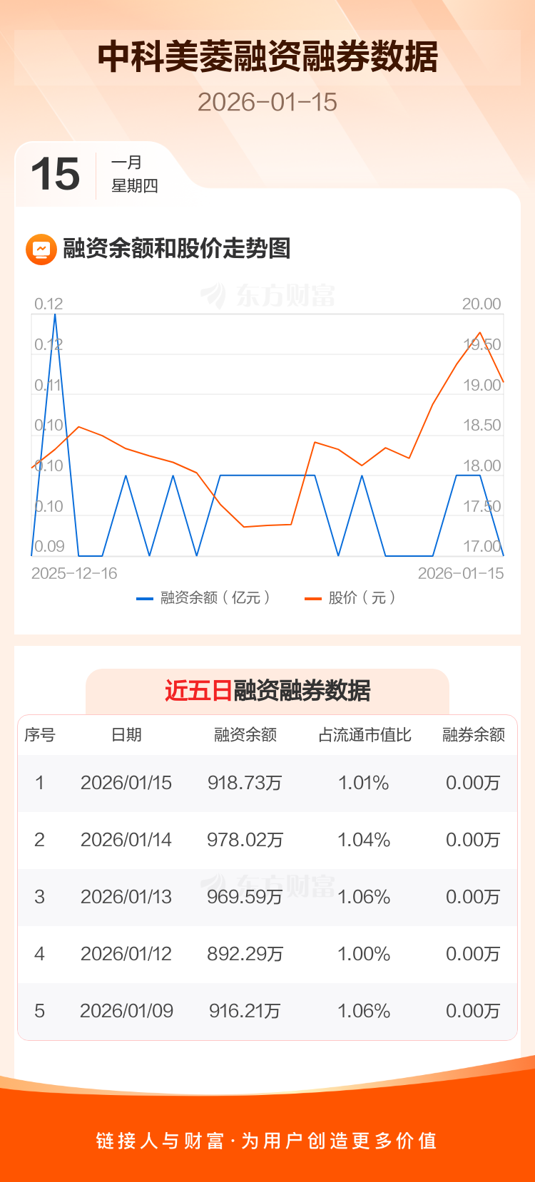 交易所最新数据显示,中科美菱于2026年1月15日获融资买入91.19万元,融资偿还150.48万元,当日融资净偿还59.29万元。目前,该股融资余额918.73万,占流通市值比例为1.01%。