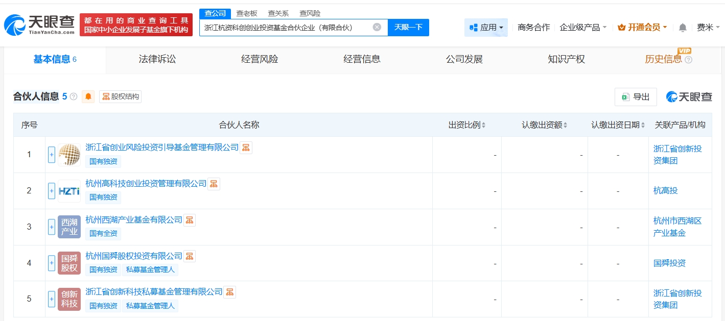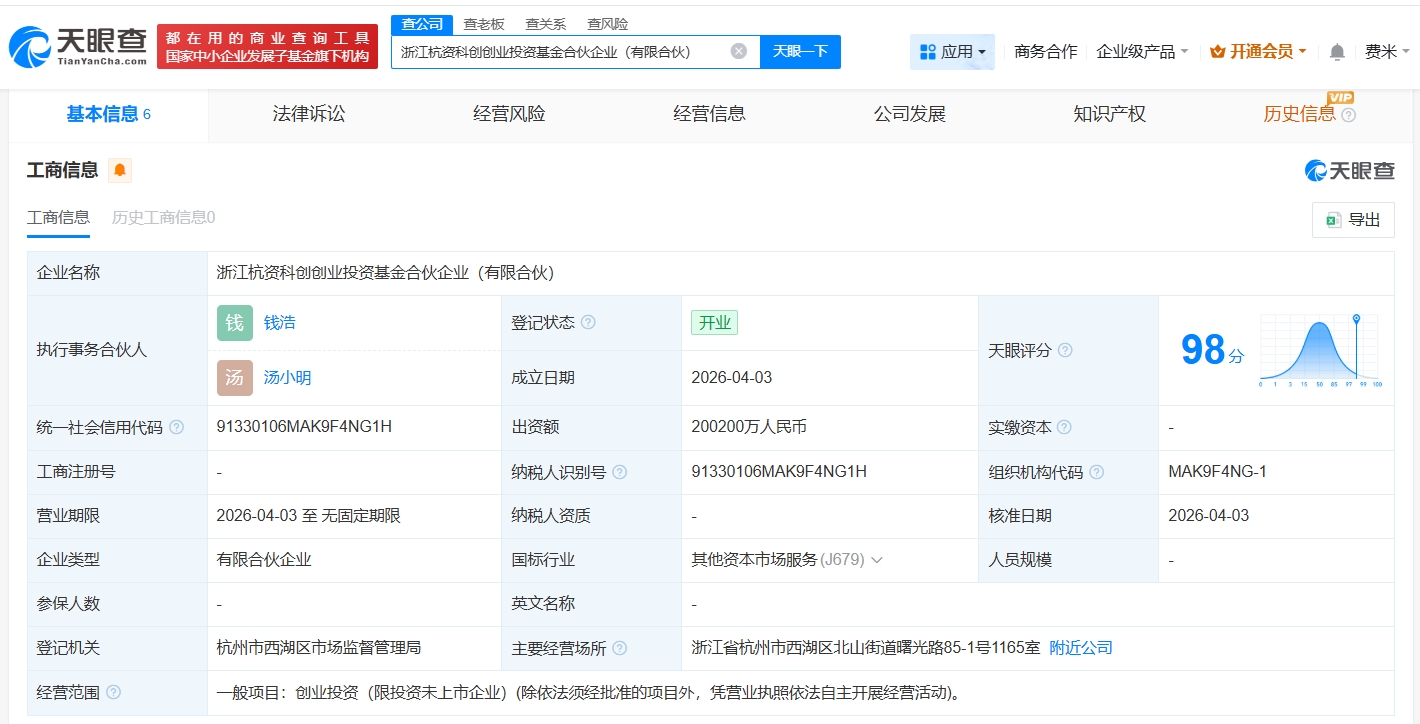 南方财经4月7日电,天眼查App显示,近日,浙江杭资科创创业投资基金合伙企业(有限合伙)成立,执行事务合伙人为钱浩、汤小明,出资额20.02亿人民币,经营范围为创业投资。合伙人信息显示,该基金由浙江省创业风险投资引导基金管理有限公司、杭州高科技创业投资管理有限公司、杭州西湖产业基金有限公司、杭州国舜股权投资有限公司、浙江省创新科技私募基金管理有限公司共同出资。