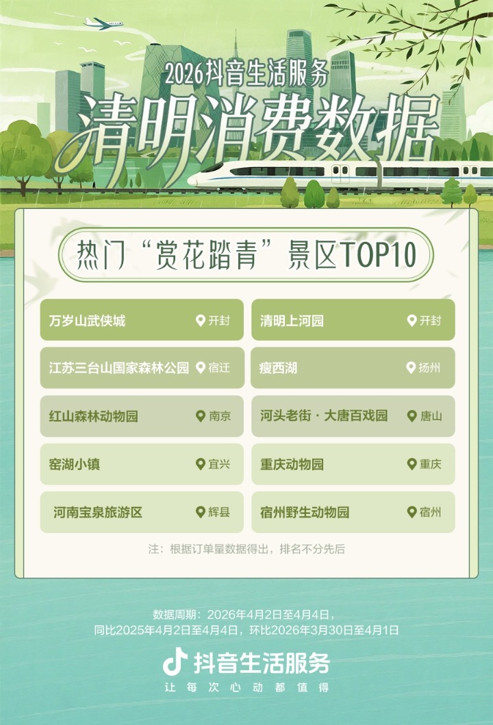 “赏花踏青”景点迎来客流高峰。清明假期,抖音景区团购订单量环比增长98%。开封万岁山武侠城、开封清明上河园、江苏三台山国家森林公园、扬州瘦西湖、南京红山森林动物园、唐山河头老街·大唐百戏园等入围“10大热门赏花踏青景点”。返乡祭祖带动抖音乡村景点订单量环比增长157%,上饶婺源篁岭风景区、枣庄台儿庄古城、保定易县狼牙山田园花海、铜陵犁桥水镇、湖州太湖演艺城入围“5大热门乡村目的地”。