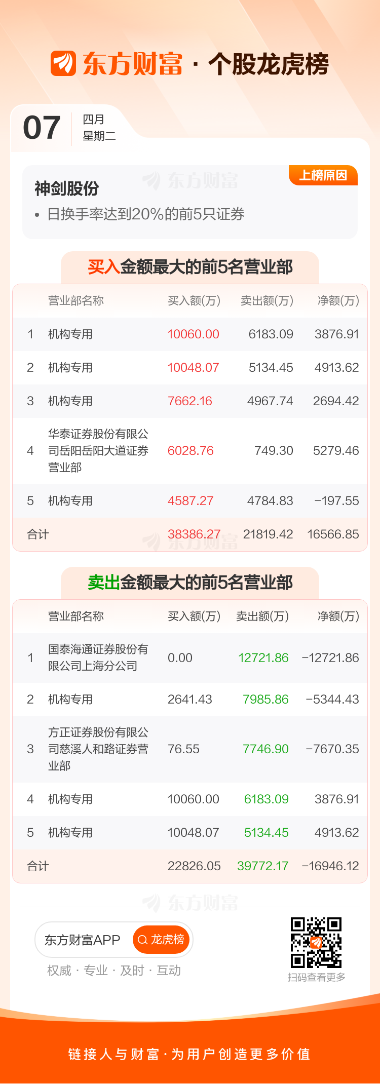 交易所2026年4月7日公布的交易公开信息显示,神剑股份因成为日换手率达到20%的前5只证券上榜。神剑股份当日收报15.25元,涨跌幅-3.11%,偏离值28.86%,换手率30.12%,成交额37.88亿。