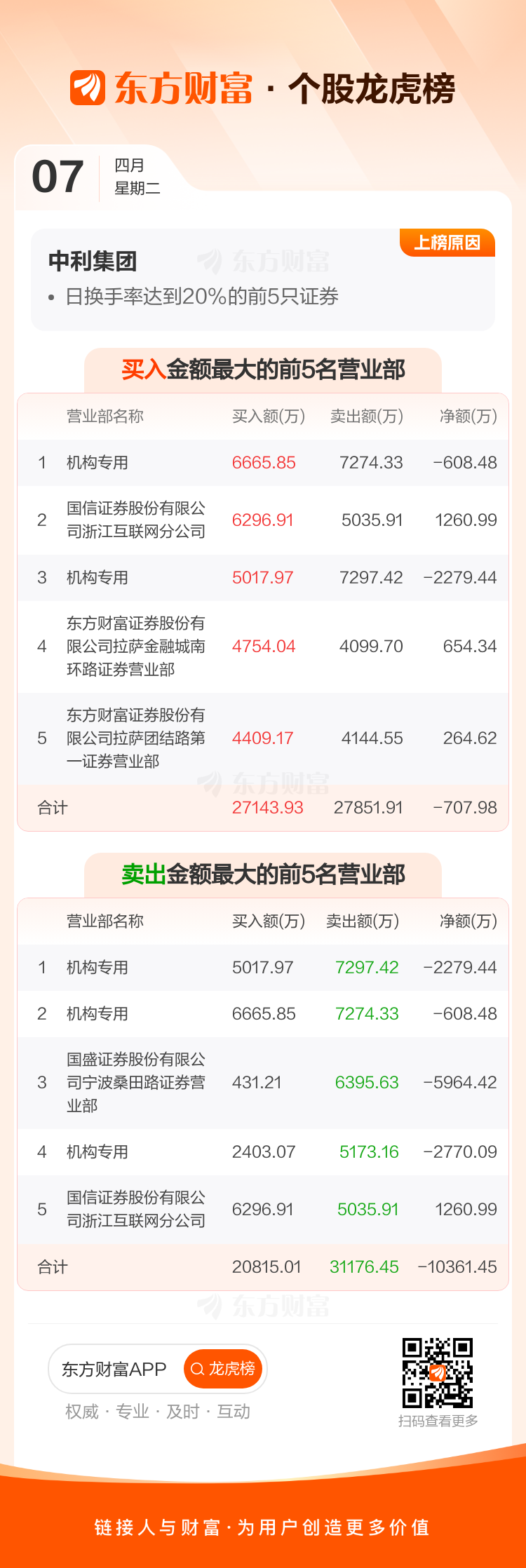 交易所2026年4月7日公布的交易公开信息显示,中利集团因成为日换手率达到20%的前5只证券上榜。中利集团当日收报5.23元,涨跌幅3.98%,偏离值34.93%,换手率34.93%,成交额43.54亿。