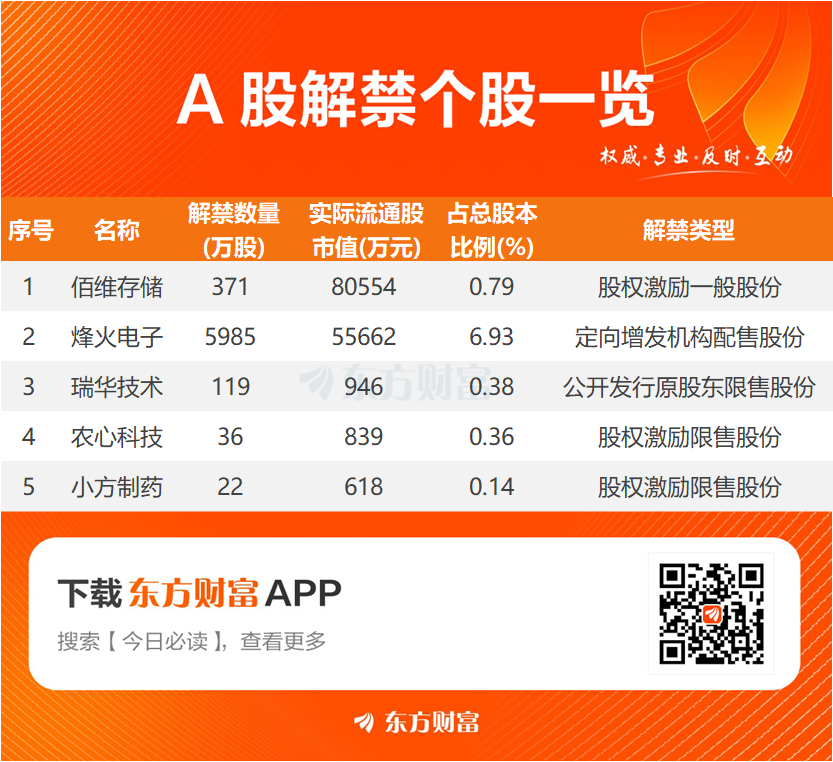 【明日解禁】明日5股解禁,佰维存储、烽火电子解禁市值居前