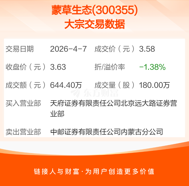 2026年4月7日,蒙草生态发生1笔大宗交易,共成交180.00万股,成交金额644.40万元,占其流通市值比例为0.14%。