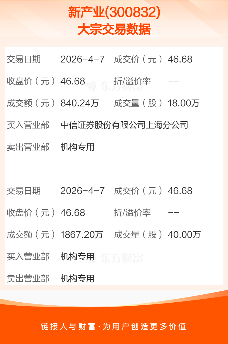 2026年4月7日,新产业发生2笔大宗交易,共成交58.00万股,成交金额2707.44万元,占其流通市值比例为0.08%。