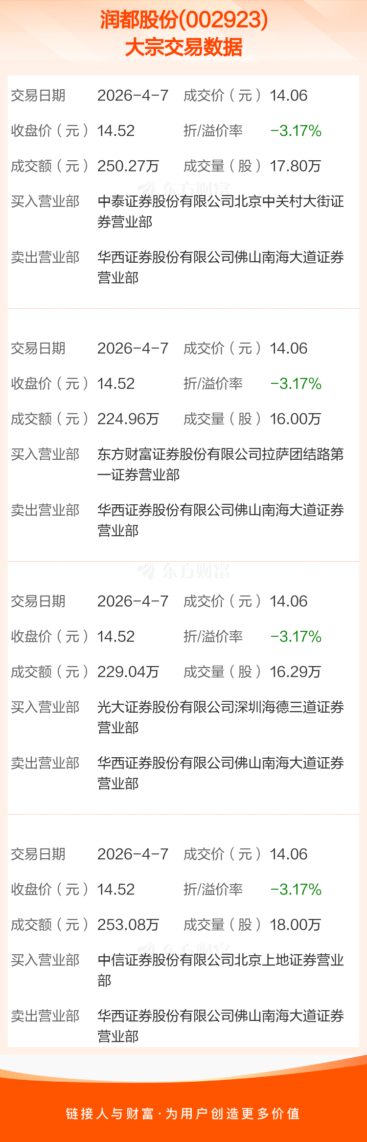 4笔大宗交易成交均价14.06元,较该股当日收盘价14.52元折价3.17%。