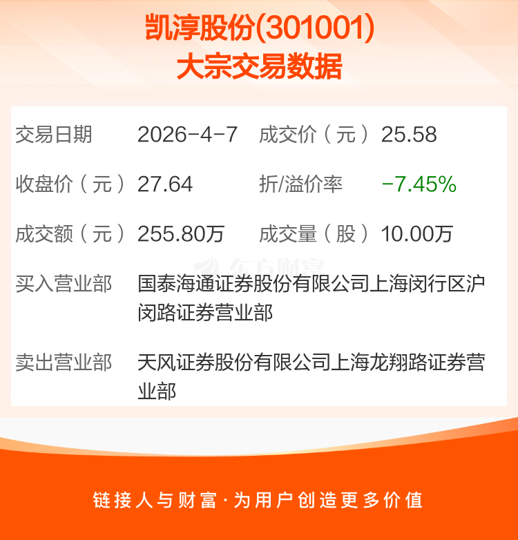 2026年4月7日,凯淳股份发生1笔大宗交易,共成交10.00万股,成交金额255.80万元,占其流通市值比例为0.18%。