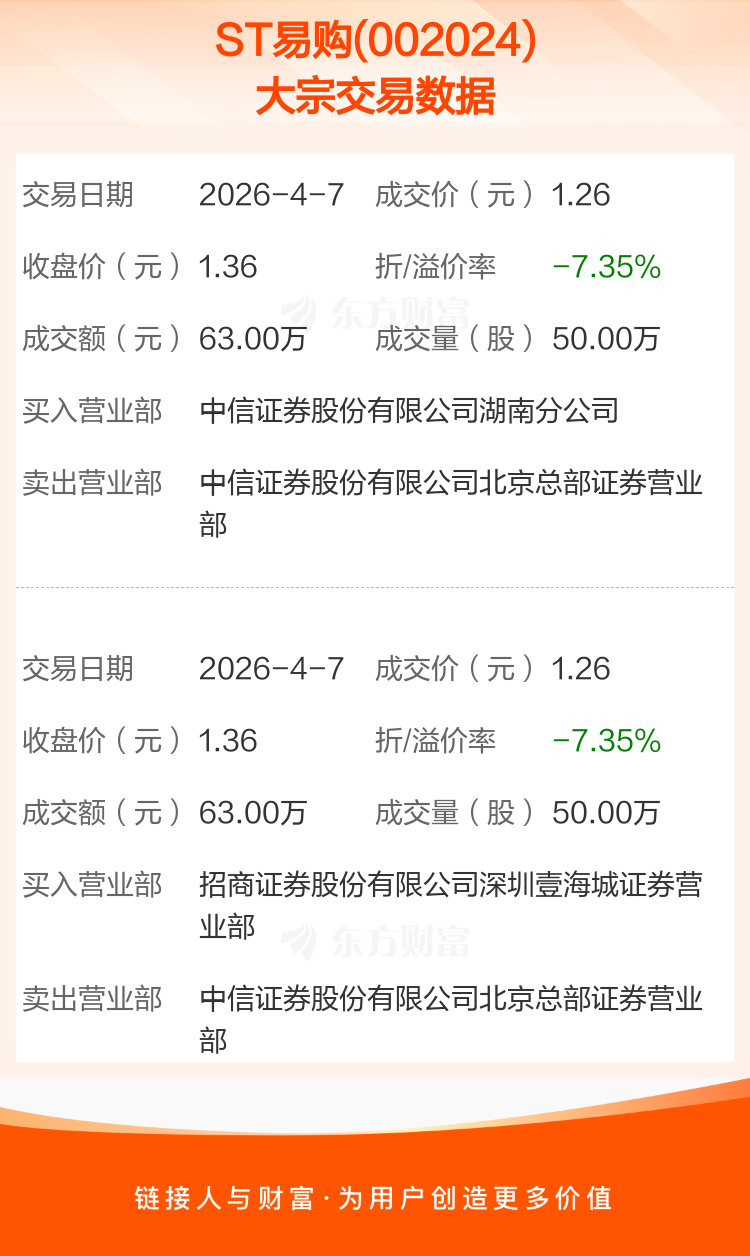 2026年4月7日,ST易购发生2笔大宗交易,共成交100.00万股,成交金额126.00万元,占其流通市值比例为0.01%。