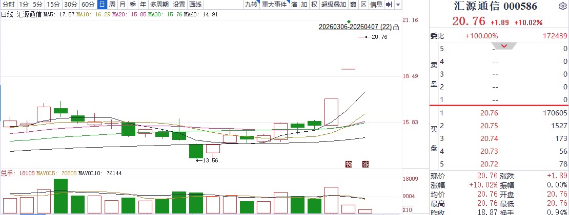 异动公告发布后 汇源通信再收“一”字涨停板