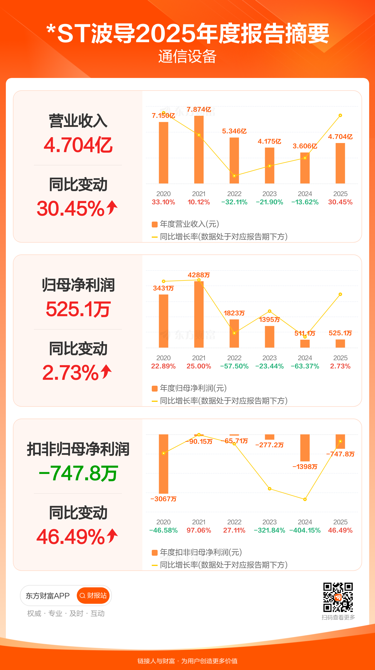 *ST波导4月8日发布2025年年报显示,公司全年实现营业收入4.70亿元,同比增长30.45%;归母净利润525.07万元,同比增长2.73%;扣非归母净利润-747.81万元。