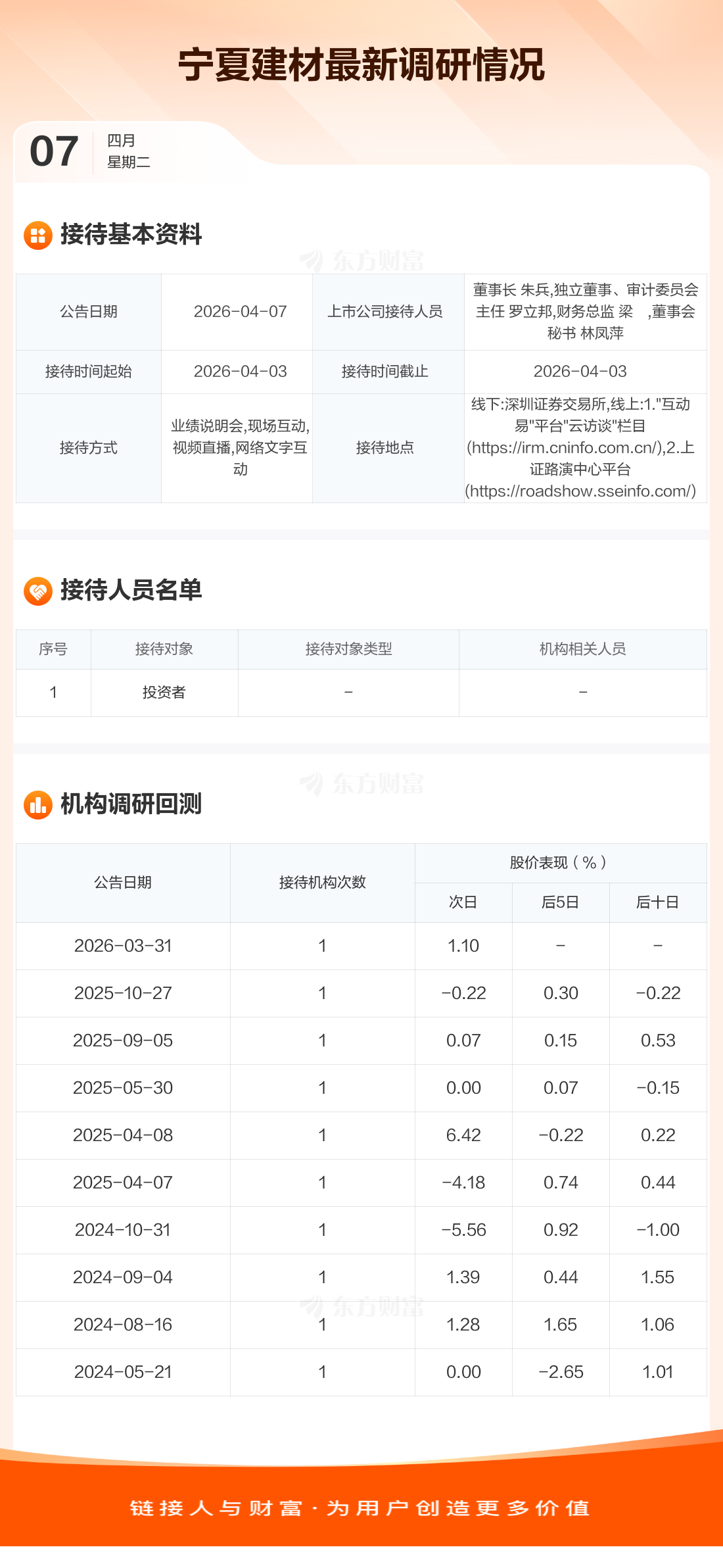 宁夏建材4月7日公告称,4月3日接待投资者等1家机构调研。接待人员包括董事长 朱兵,独立董事、审计委员会主任 罗立邦,财务总监 梁澐,董事会秘书 林凤萍。
