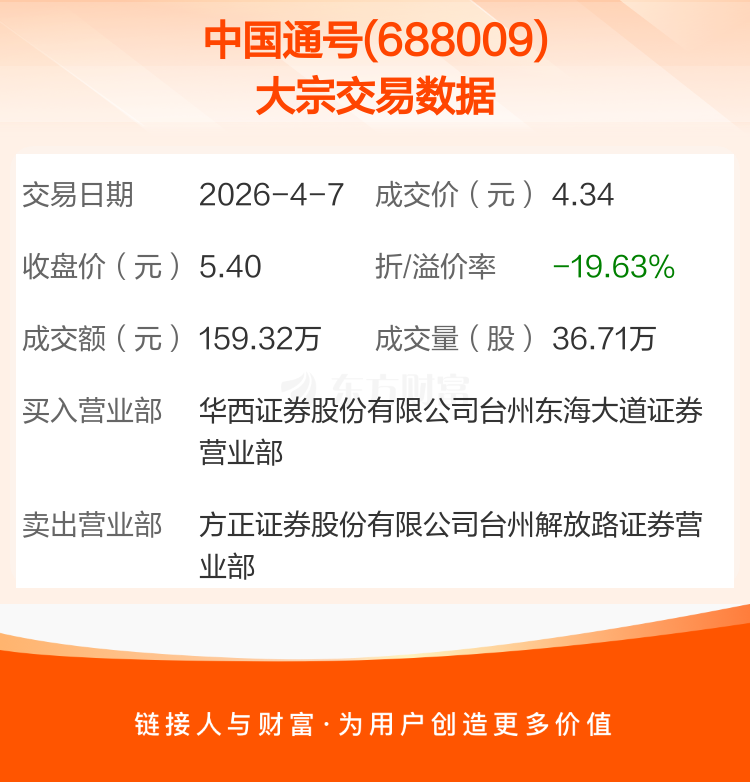 大宗交易:中国通号成交159.32万元,折价19.63%(4-7)