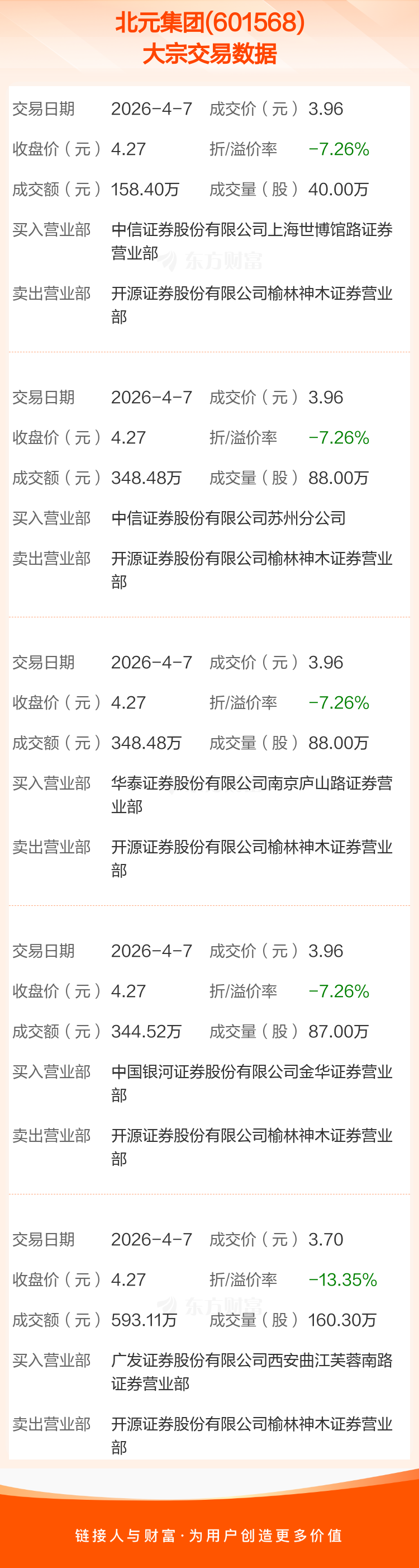 2026年4月7日,北元集团发生5笔大宗交易,共成交463.30万股,成交金额1792.99万元,占其流通市值比例为0.11%。