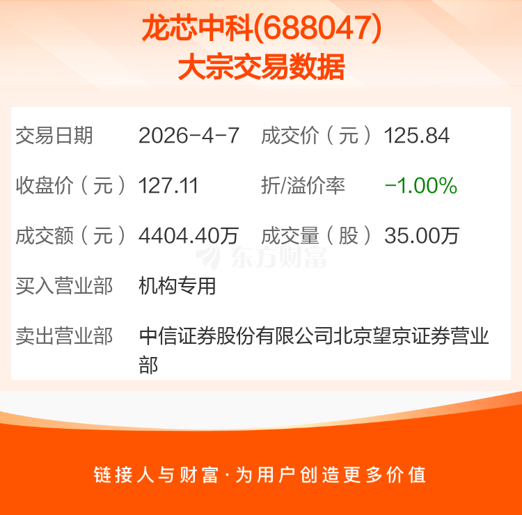 2026年4月7日,龙芯中科发生1笔大宗交易,共成交35.00万股,成交金额4404.40万元,占其流通市值比例为0.09%。
