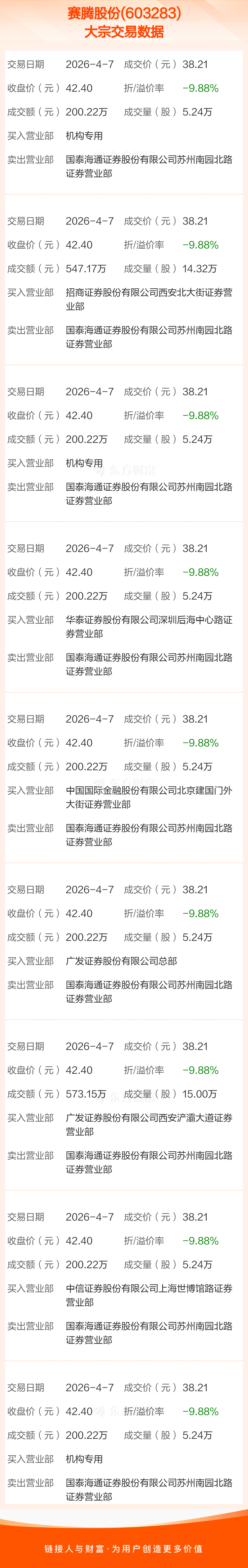 2026年4月7日,赛腾股份发生9笔大宗交易,共成交66.00万股,成交金额2521.86万元,占其流通市值比例为0.22%。