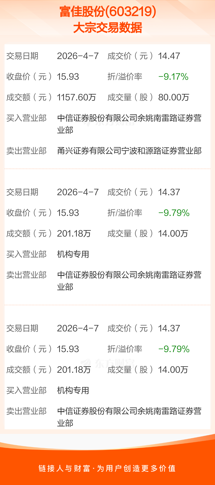 2026年4月7日,富佳股份发生3笔大宗交易,共成交108.00万股,成交金额1559.96万元,占其流通市值比例为0.17%。