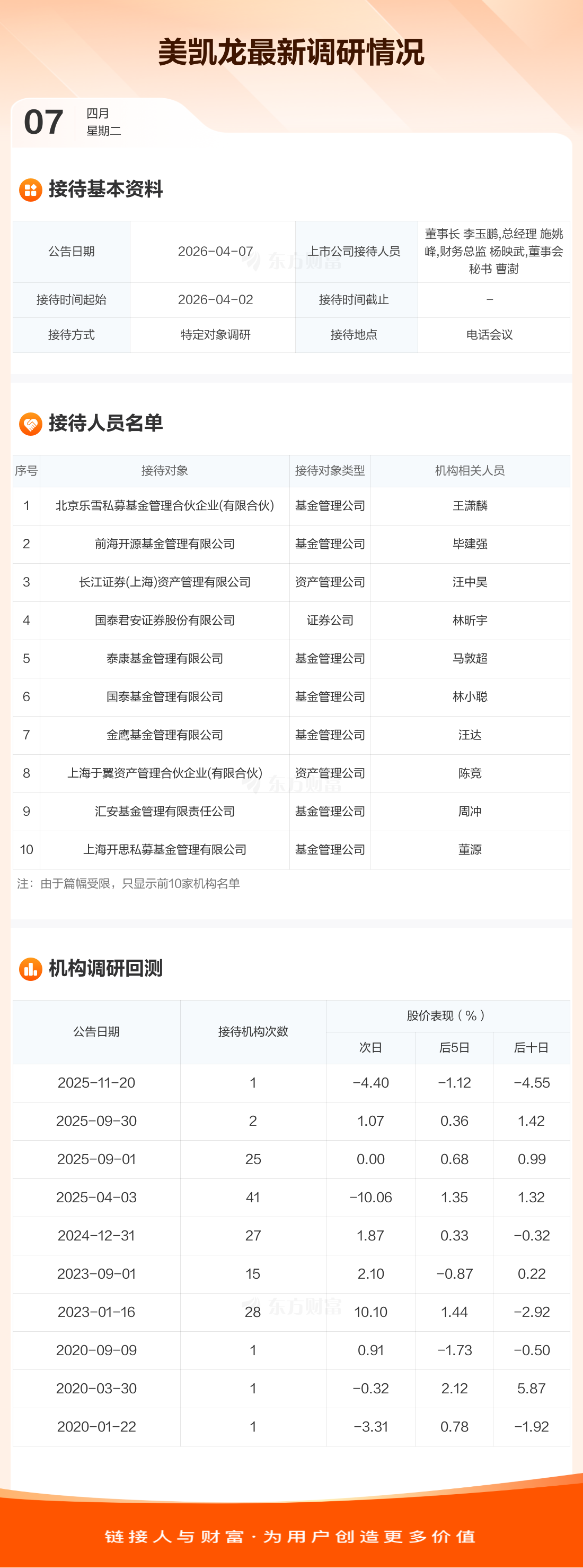 美凯龙4月7日公告称,4月2日接待北京乐雪私募基金管理合伙企业(有限合伙)等33家机构调研。接待人员包括董事长 李玉鹏,总经理 施姚峰,财务总监 杨映武,董事会秘书 曹澍。