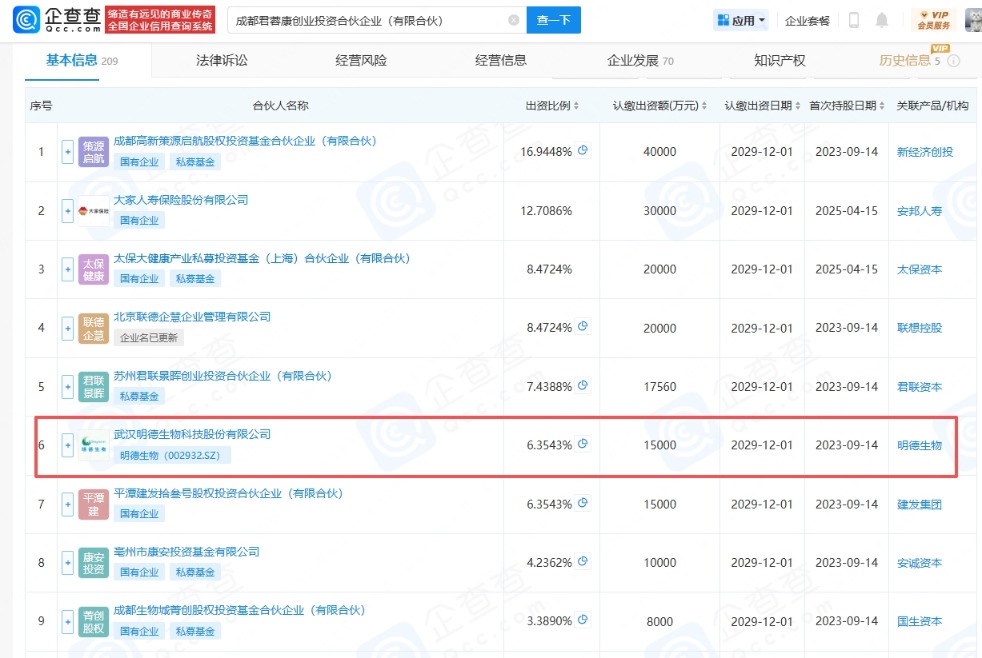 据了解,2023年6月,明德生物与成都君祺企业管理咨询合伙企业(有限合伙)、成都高新策源启航股权投资基金合伙企业(有限合伙)、西藏联投企慧企业管理有限公司、苏州君联景晖创业投资合伙企业(有限合伙)、平潭建发拾叁号股权投资合伙企业(有限合伙)、亳州市康安投资基金有限公司、成都生物城菁创股权投资基金合伙企业(有限合伙)、苏州君联睿思创业投资合伙企业(有限合伙)、北京键凯科技股份有限公司、郑州龙华医药产业基金合伙企业(有限合伙)、安徽迎驾投资管理有限公司、深圳科瑞技术股份有限公司、苏州义仓生物科技有限公司、盛景云(天津)互联网信息服务有限公司共同签署《成都君蓉康创业投资合伙企业有限合伙协议》,参与投资基金成都君蓉康创业投资合伙企业(有限合伙)。该基金的规模为人民币160,000万元,基金聚焦创新药及生物技术、医疗器械及诊断技术、专业服务及供应链,重点关注早期创新、供应链本土化、国际化方向的投资。
