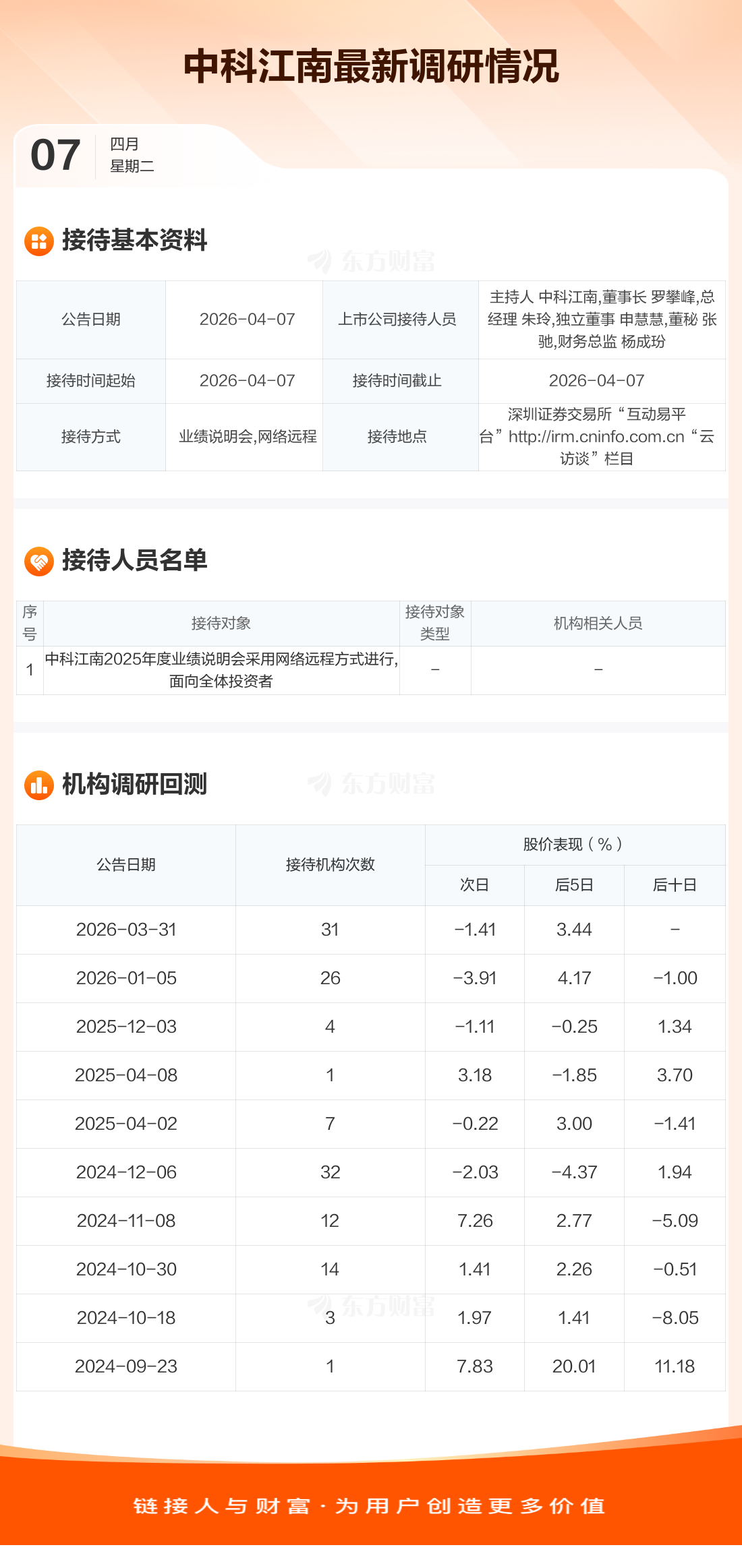 中科江南4月7日公告称,4月7日接待中科江南2025年度业绩说明会采用网络远程方式进行,面向全体投资者等1家机构调研。接待人员包括主持人 中科江南,董事长 罗攀峰,总经理 朱玲,独立董事 申慧慧,董秘 张驰,财务总监 杨成玢。