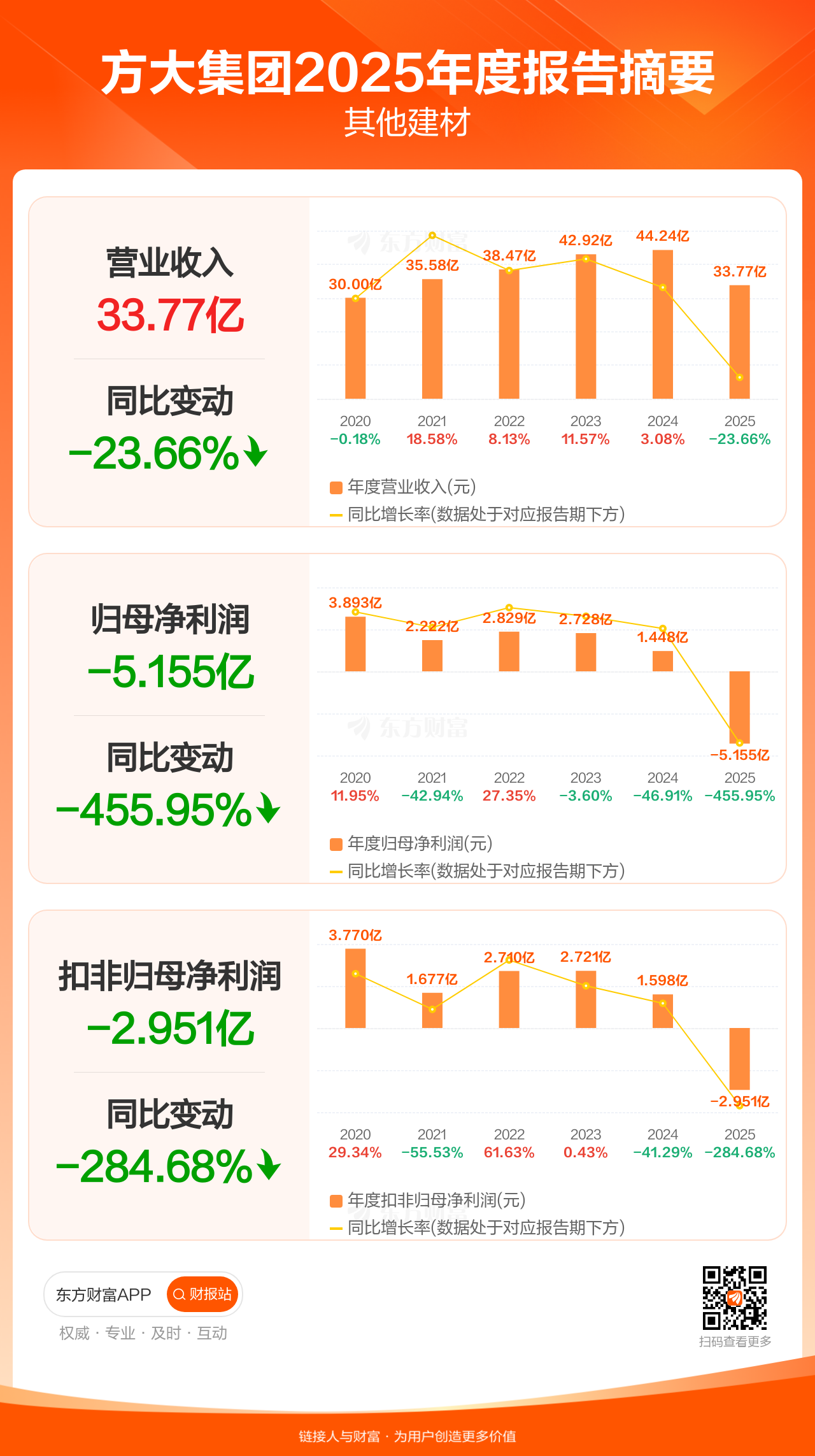 方大集团4月8日发布2025年年报显示,公司全年实现营业收入33.77亿元,同比下滑23.66%;归母净利润-5.15亿元;扣非归母净利润-2.95亿元。